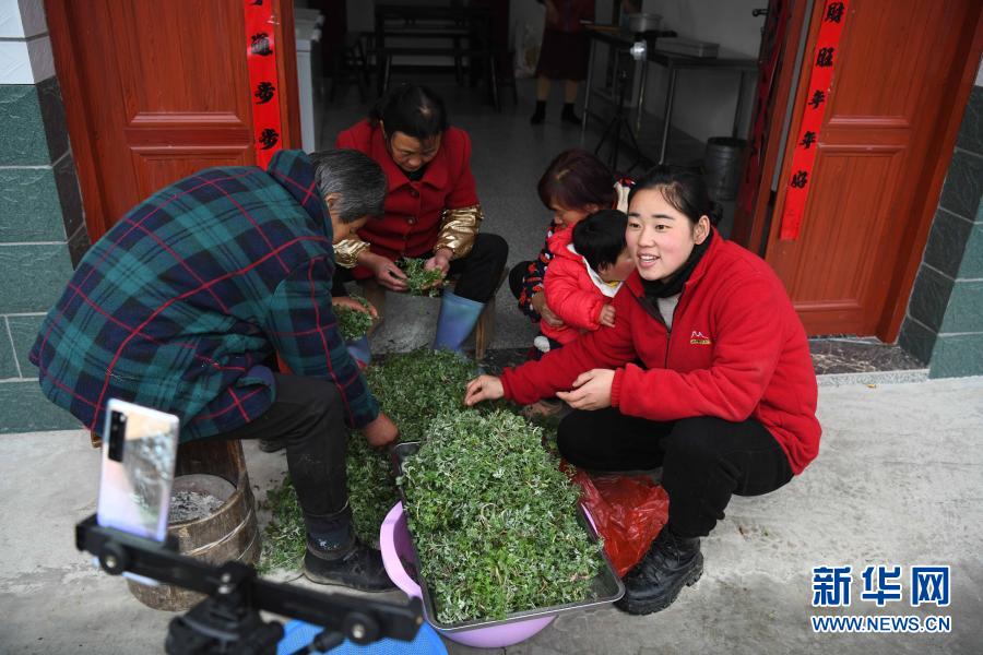 張志菊(右一)在直播村民制作蒿子粑粑的過程(2月26日攝)。