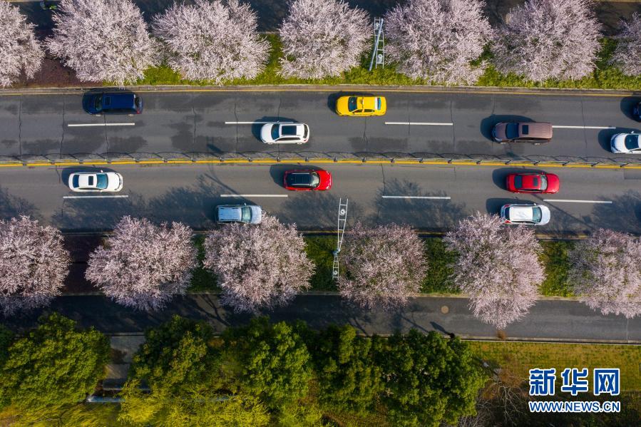 3月2日,汽車(chē)行駛在鮮花盛開(kāi)的江蘇省昆山市馬鞍山路上(無(wú)人機(jī)照片)。春回大地,各地繁花盛開(kāi),春意盎然、生機(jī)勃勃。