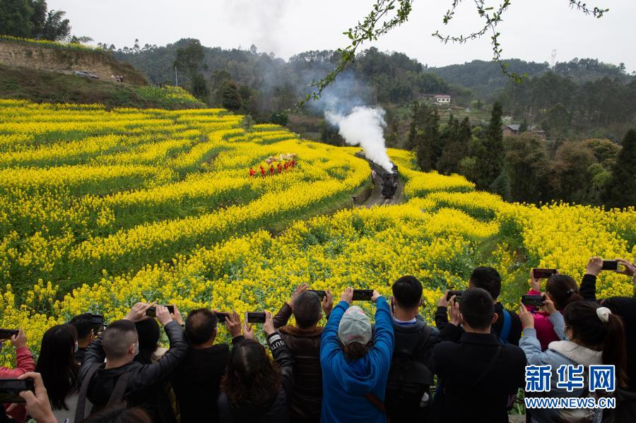 3月2日,一列嘉陽小火車經過段家灣蜜蜂巖的油菜花海,吸引眾多游客拍照。