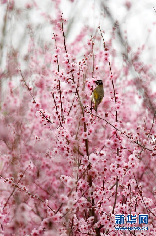 3月8日,在江蘇南京梅花山,一只小鳥(niǎo)在美人梅枝頭棲息。