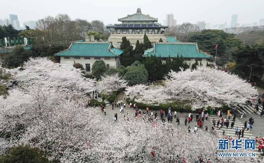 3月13日,來自各地的援鄂醫(yī)護(hù)人員在武漢大學(xué)校園共赴櫻花之約(無人機(jī)照片)。新華社記者 程敏 攝