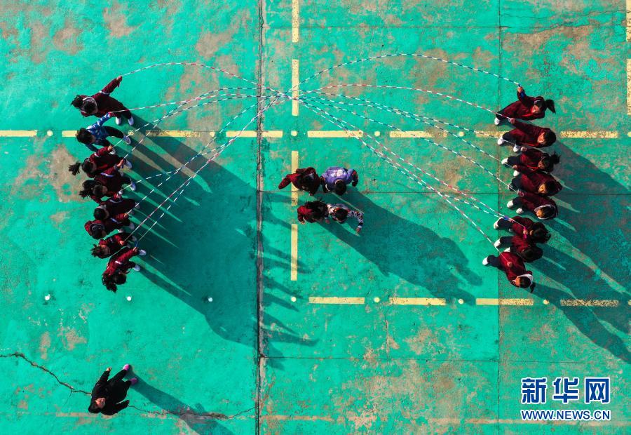 騎路小學的學生們在大課間練習“大網(wǎng)繩跳”(3月10日攝,無人機照片)。新華社記者 楊磊 攝