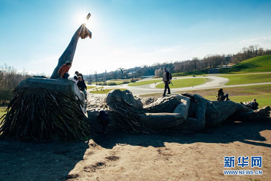 這是3月20日在比利時博姆市的德舒爾森林公園拍攝的“巨人”雕塑。新華社記者 張鋮 攝