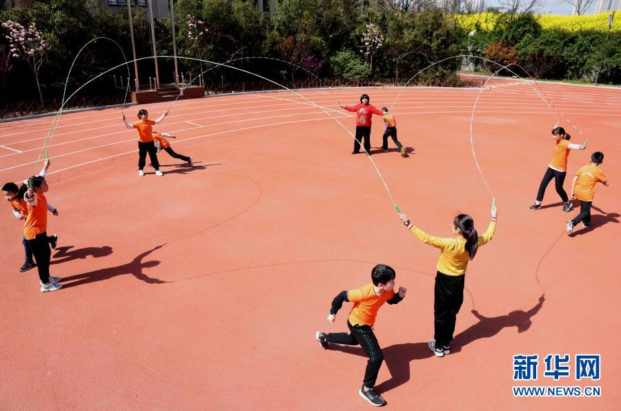 3月23日,在合肥市大通路小學新海校區(qū),學生在大課間練習花樣跳繩。