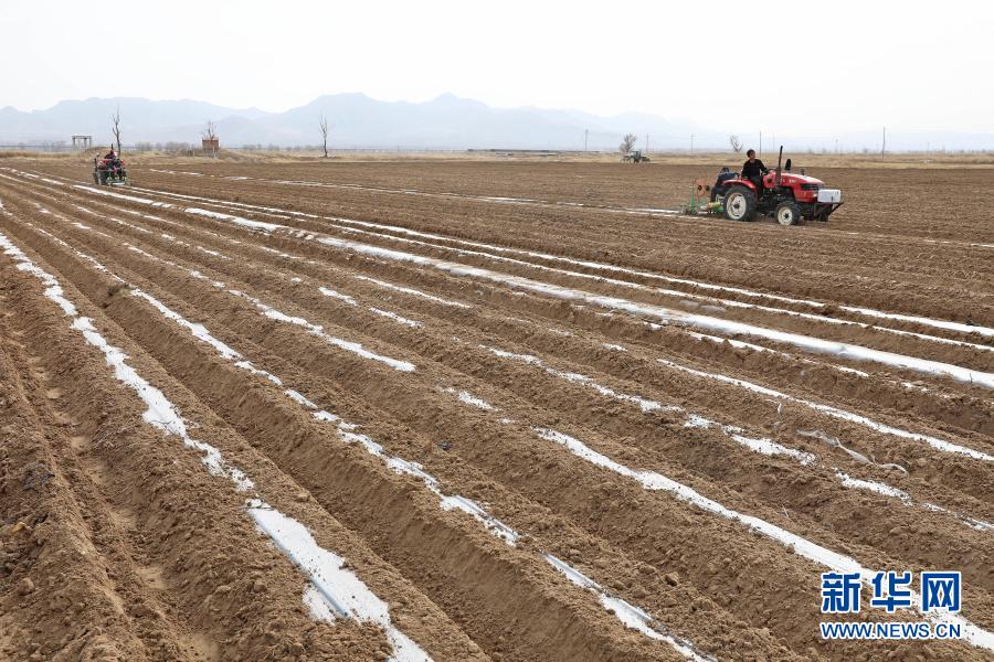 3月23日,工人操作機(jī)械設(shè)備在河北省張家口市萬全區(qū)孔家莊鎮(zhèn)張杰莊村為剛播種的馬鈴薯覆膜。