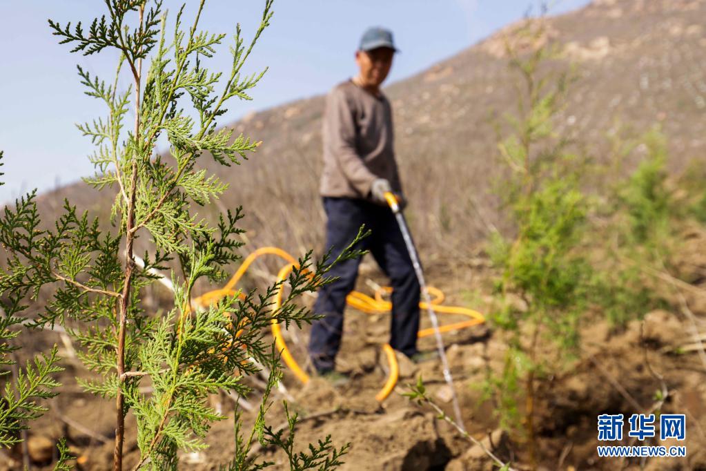 3月31日,造林隊(duì)員在河北省遵化市石門鎮(zhèn)金星山給新栽的樹苗澆水。