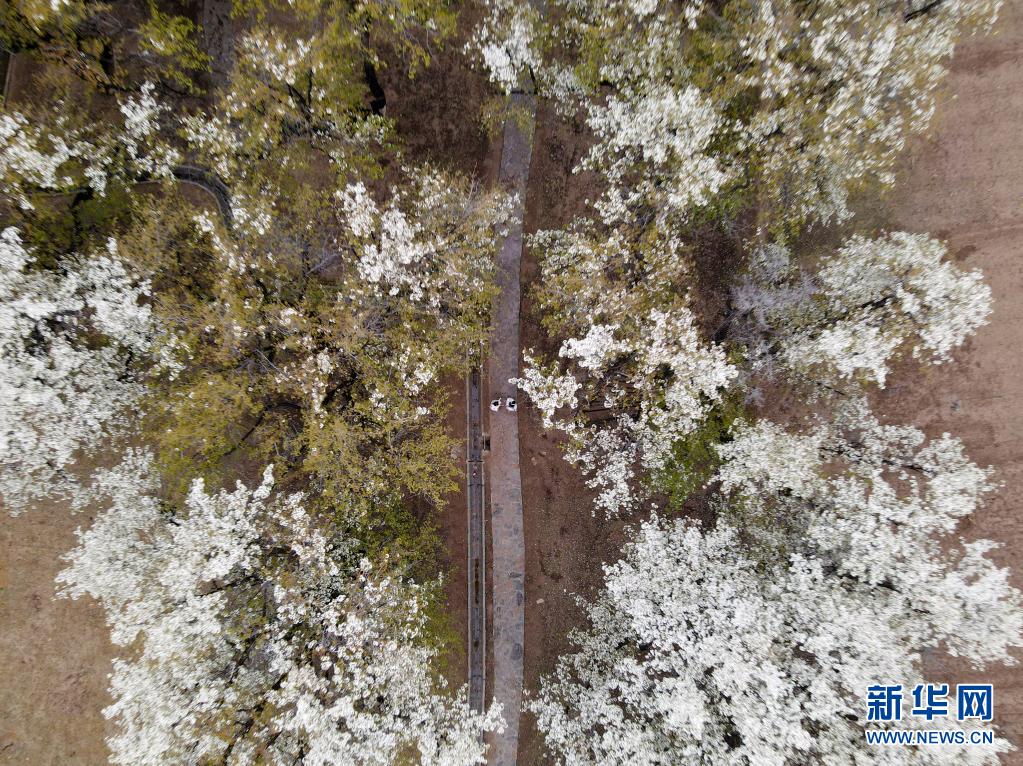 4月3日,游客在中衛(wèi)市南長灘村觀賞盛開的梨花(無人機照片)。
