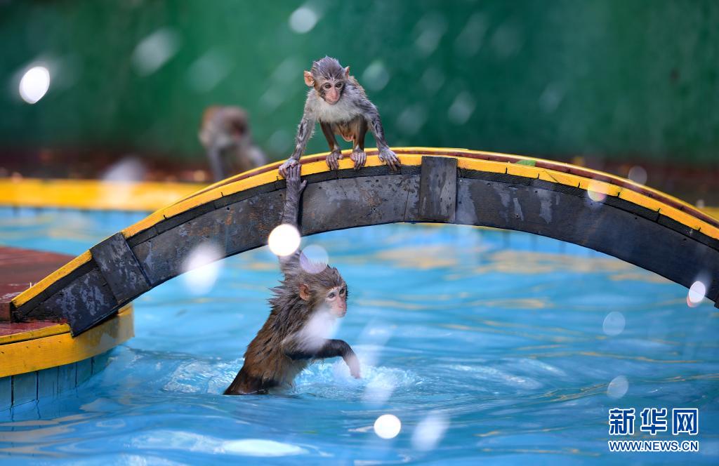 4月4日,獼猴在南灣猴島保護區(qū)里戲水。