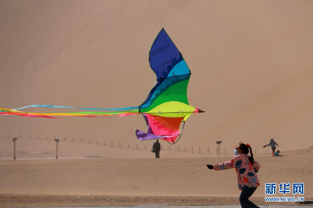 4月5日,小朋友在甘肅省敦煌市鳴沙山月牙泉景區(qū)山門廣場(chǎng)放風(fēng)箏。