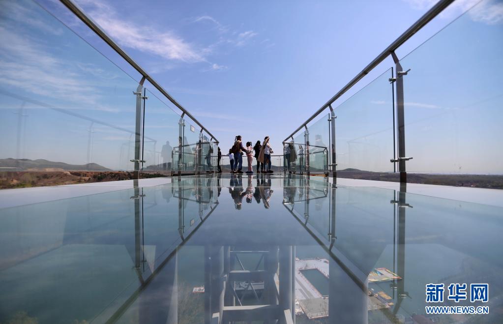 4月5日,游客在山東省臨沂市沂南縣紅石寨景區(qū)內體驗高空玻璃棧道。