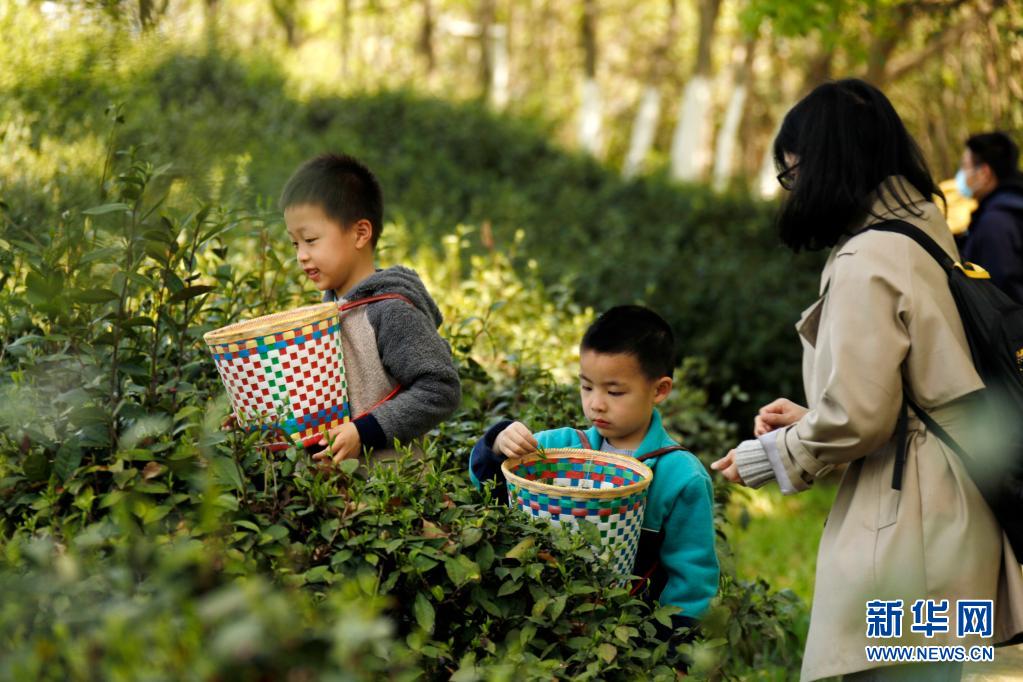 4月5日,家長陪伴孩子在南京科技館茶園體驗(yàn)采茶。