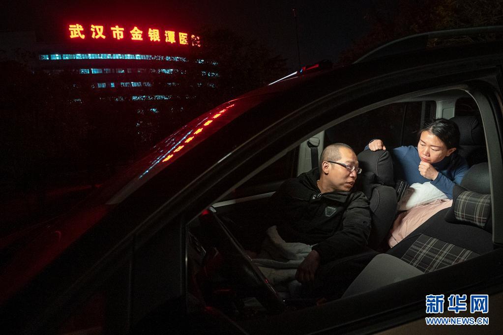 2020年2月22日晚,武漢市金銀潭醫(yī)院的醫(yī)護夫妻涂盛錦(左)與曹珊在車內聊天。從大年初一開始,兩人就住進車里,為在疫情中搶救病患,爭分奪秒,以車為家。新華社記者 熊琦 攝