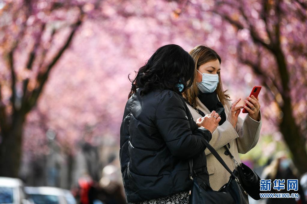 4月13日,兩名游人在德國波恩老城區(qū)用手機拍攝盛開的櫻花。