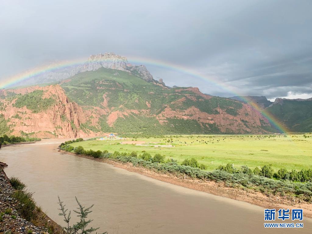 這是在青海省玉樹藏族自治州雜多縣的昂賽大峽谷拍攝的彩虹(2020年8月22日攝)。