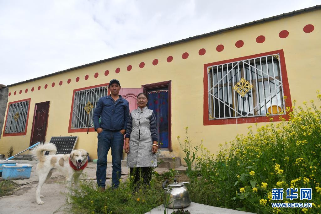 在青海省玉樹(shù)藏族自治州治多縣治渠鄉(xiāng)同卡村,村民昂文西讓和妻子布沙措江卓瑪站在易地搬遷的新家院子里合影(2019年9月12日攝)。