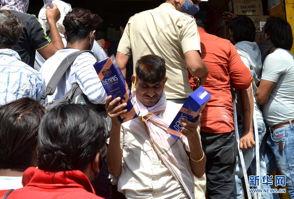 4月19日,印度新德里居民在全城實施封鎖前搶購酒品。