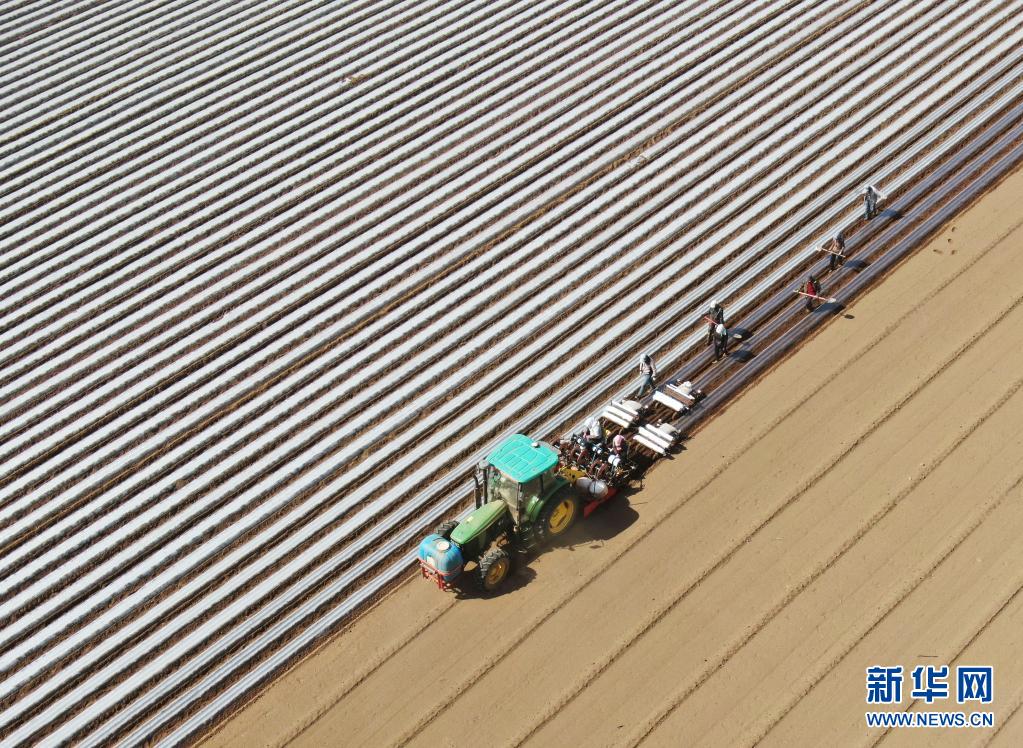 4月20日,工人操作機(jī)械設(shè)備在河北省張家口市塞北管理區(qū)農(nóng)業(yè)基地為剛播種的胡蘿卜覆膜(無人機(jī)照片)。