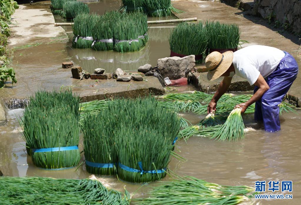 4月20日,浙江省樂清市雁蕩鎮(zhèn)的香蔥種植專業(yè)合作社社員在清洗剛采摘的香蔥。