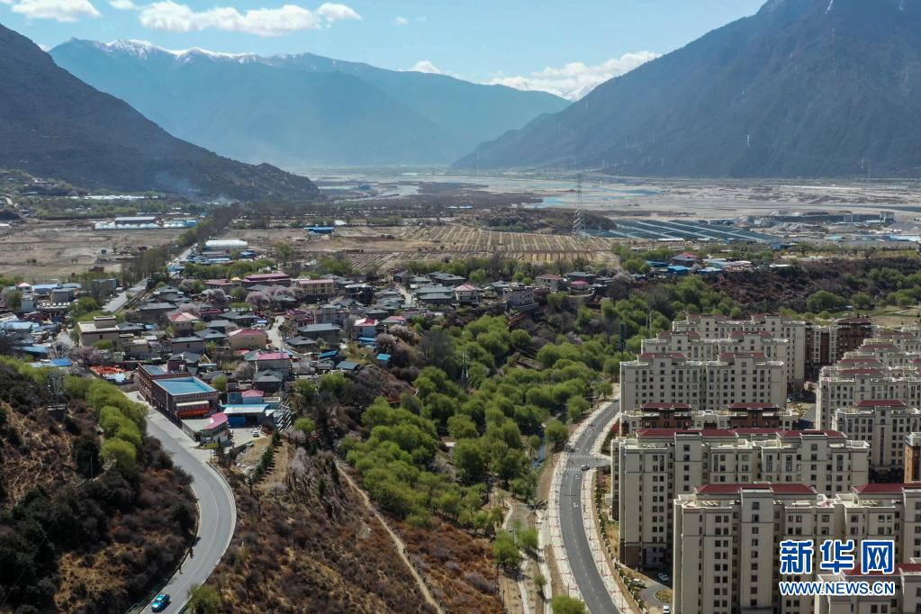 這是西藏林芝市巴宜區(qū)巴吉村(畫(huà)面左側(cè))及毗鄰的八一鎮(zhèn)(4月6日攝,無(wú)人機(jī)照片)。新華社記者 洛卓嘉措 攝
