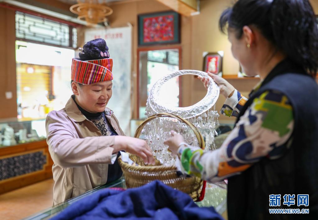 張佳麗的母親張?jiān)ⅲㄗ螅⒚缱迨⒀b的銀飾拿到銀飾店清洗(4月23日攝)。