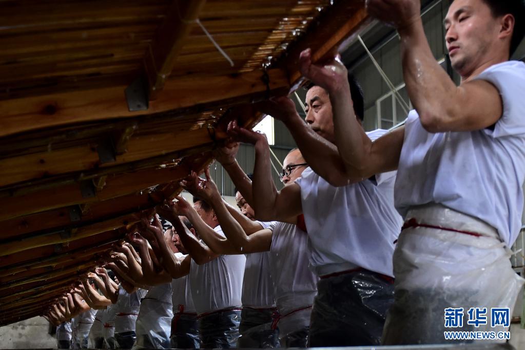 近日,在宣紙產(chǎn)地安徽省宣城市涇縣,“四丈宣紙”的抄制在一家紙業(yè)有限公司啟動。50余名撈紙師傅操作巨型紙簾,齊心協(xié)力,在紙槽旁進行撈紙作業(yè)。來回起落兩次,動作整齊劃一。隨后工人們將紙簾吊起放至一邊揭下,一張巨大的宣紙便撈制成功。經(jīng)過曬、剪等工序后, 制成長13.2米、寬3.6米的巨型宣紙就是“四丈宣紙”。