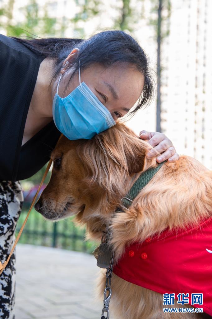 生活在南京市建鄴區(qū)的陳冬梅與導(dǎo)盲犬“果凍”在一起(4月4日攝)?! ⌒氯A社發(fā) (張夢 攝)