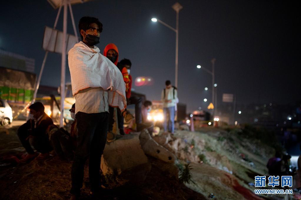 4月28日晚,人們?cè)谀岵礌柺锥技拥聺M都的路邊等車,準(zhǔn)備在封禁措施實(shí)施前離開(kāi)加德滿都返回家鄉(xiāng)。