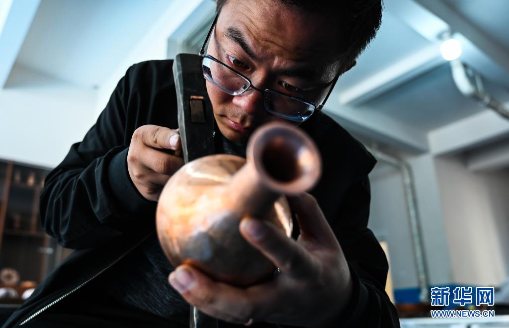地處滇東北、烏蒙山腹地的云南會澤縣流傳著具有300多年歷史的斑銅制作工藝。斑銅工藝復(fù)雜,要采用高品位的銅為原料,經(jīng)過20余道工序制作而成。產(chǎn)品“妙在有斑,貴在渾厚”,風(fēng)格獨樹一幟。33歲的張偉是會澤“張氏斑銅”的第十三代傳人。自幼深受地域文化和家庭熏陶的他,大學(xué)畢業(yè)后,返鄉(xiāng)從事斑銅制作工作。在會澤古城的“銅匠街”,張偉創(chuàng)辦了斑銅傳習(xí)館,不斷研發(fā)斑銅新產(chǎn)品、傳承著這項非遺技藝?!鞍咩~是一種情感、一種文化,希望在我們這代人的努力下能夠更好地將它傳承下去,讓更多人了解斑銅的獨特魅力?!睆垈フf。