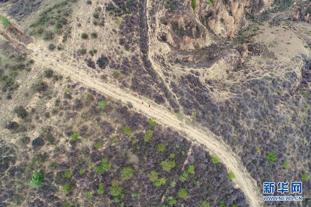 4月27日,延長氣田采氣二廠巡線隊員在巡線途中(無人機(jī)照片)。