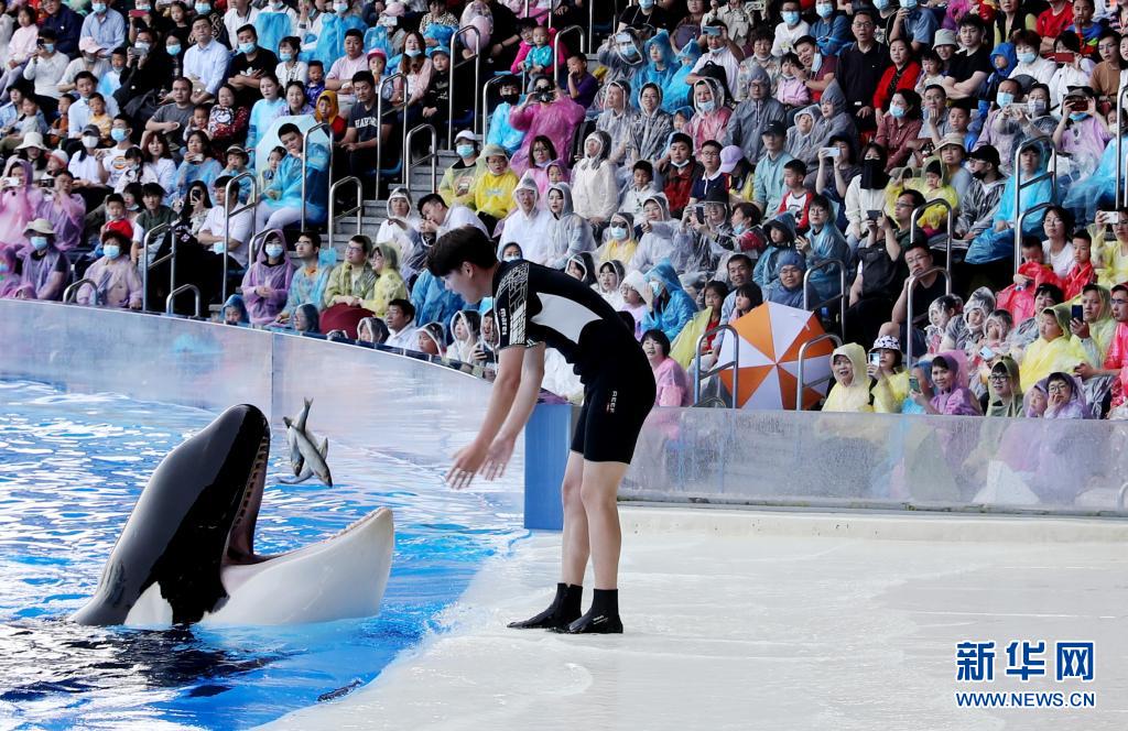 5月1日,飼養(yǎng)員在虎鯨科普秀活動中給虎鯨投喂小魚“獎勵”。
