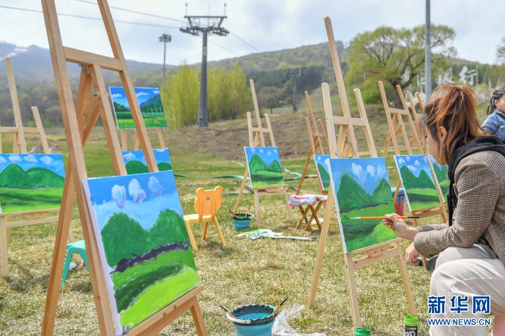 5月1日,在吉林市萬科松花湖度假區(qū),游客在山坡上繪畫寫生。