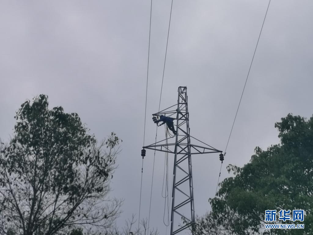 “跑山電工”黨員服務(wù)隊(duì)隊(duì)員在塔上連接線路(5月3日攝)。