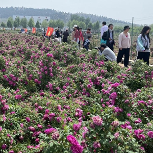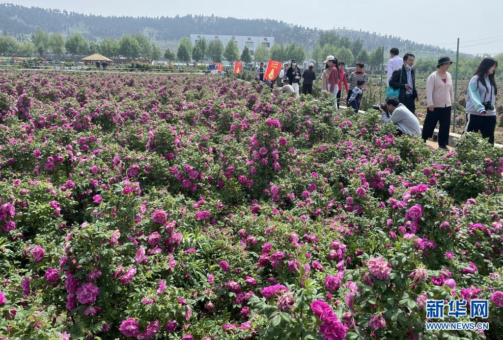 5月4日,游客在平陰縣玫瑰園欣賞盛開的玫瑰。