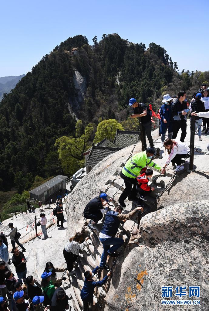 5月5日,華山景區(qū)保安協(xié)助小朋友攀登華山西峰。