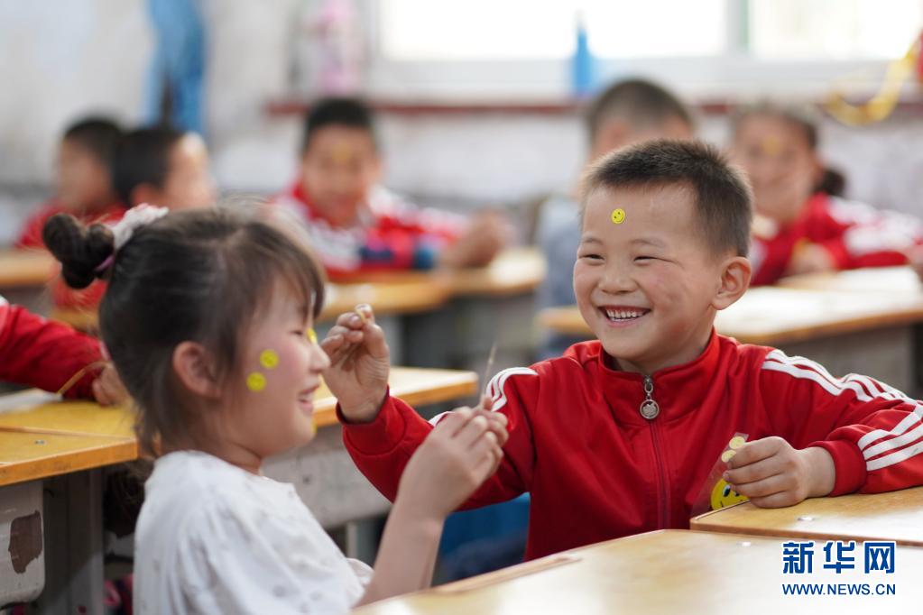 5月7日,河北省邢臺市內(nèi)丘縣南賽中心小學(xué)的學(xué)生在教室做貼笑臉游戲。世界精神衛(wèi)生組織將每年的5月8日定為“世界微笑日”,希望通過微笑促進人類身心健康,增進社會和諧。新華社發(fā)(劉繼東 攝)