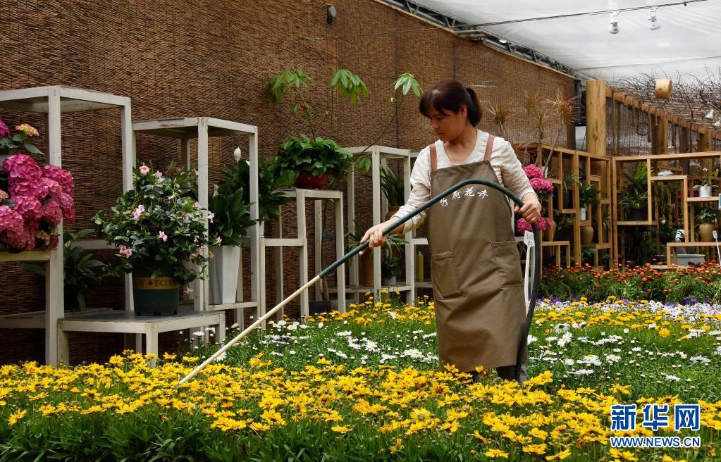 5月7日,在秦嶺花世界現(xiàn)代農(nóng)業(yè)園區(qū),一名園藝工人在澆花。