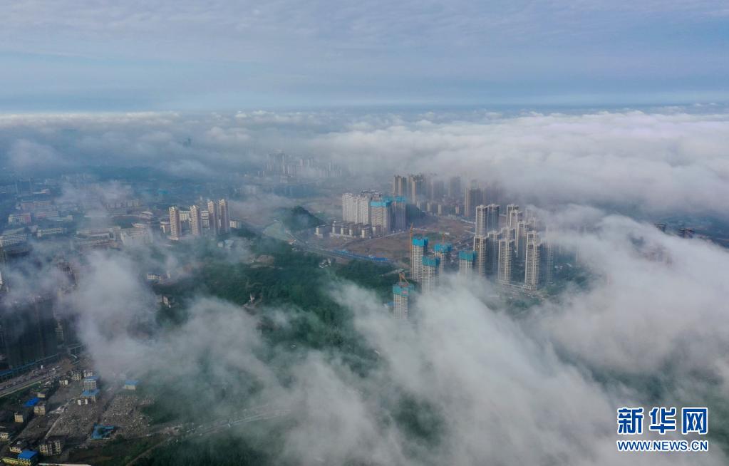 5月8日,貴陽市觀山湖區(qū)的高樓被霧氣籠罩(無人機(jī)照片)。