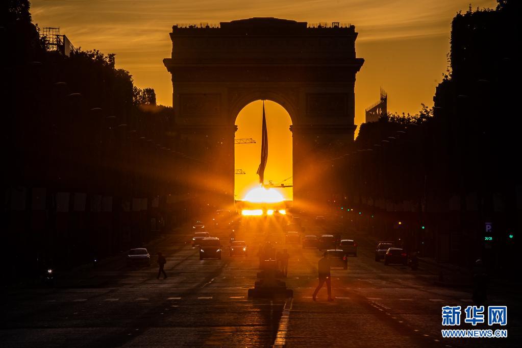 這是5月8日在法國巴黎香榭麗舍大街拍攝的凱旋門落日景象。