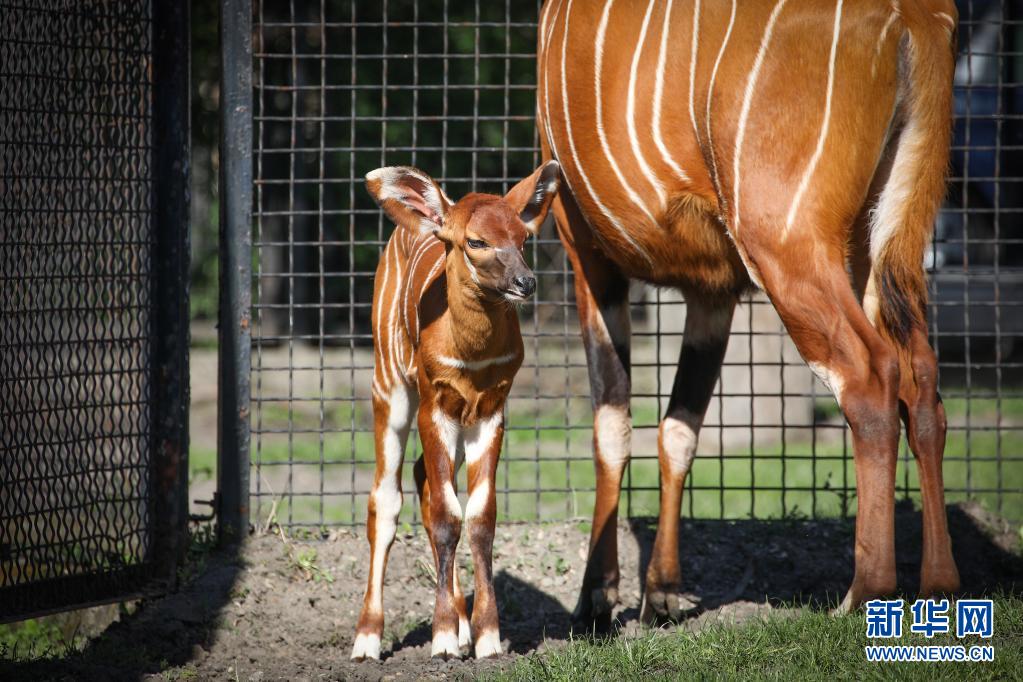 5月10日,兩周大的幼年山地紫羚與母親一起在波蘭首都華沙的華沙動(dòng)物園的籠舍中散步。