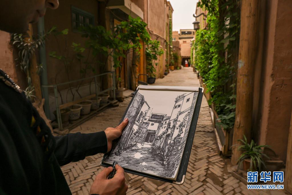 麥麥提吐爾遜江·麥麥提依明在新疆喀什古城景區(qū)的小巷內(nèi)進行速寫創(chuàng)作(5月6日攝)。新華社記者 胡虎虎 攝