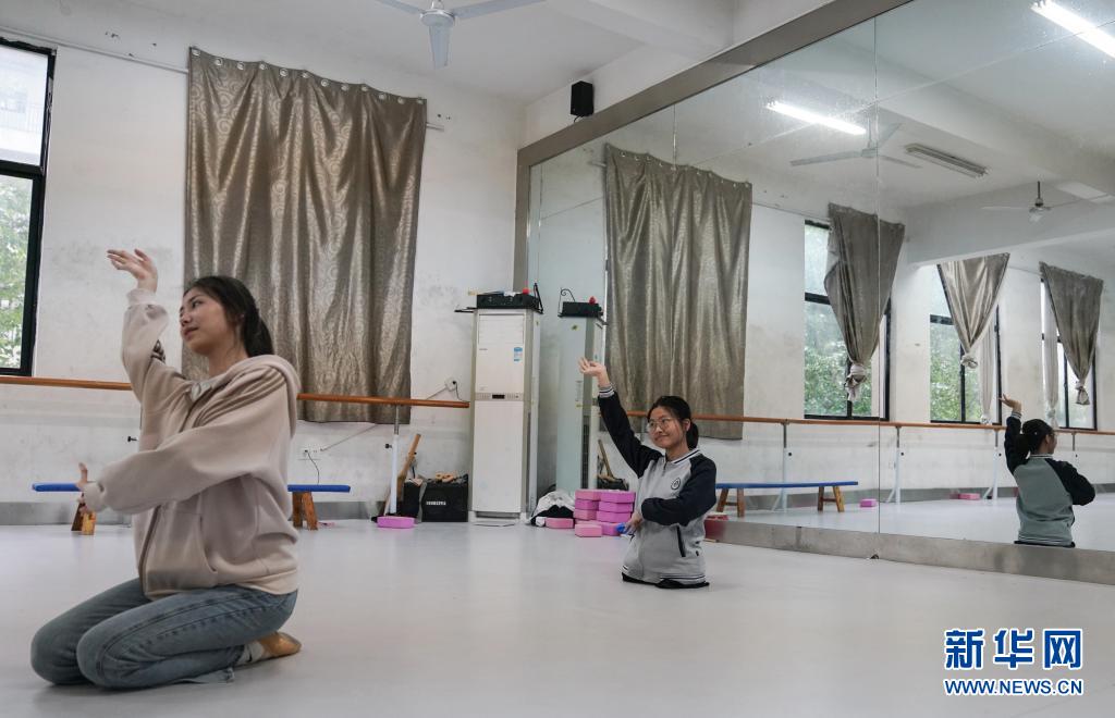 2021年5月11日,蔣張子怡(右)和同學(xué)在舞蹈房內(nèi)練習(xí)舞蹈。