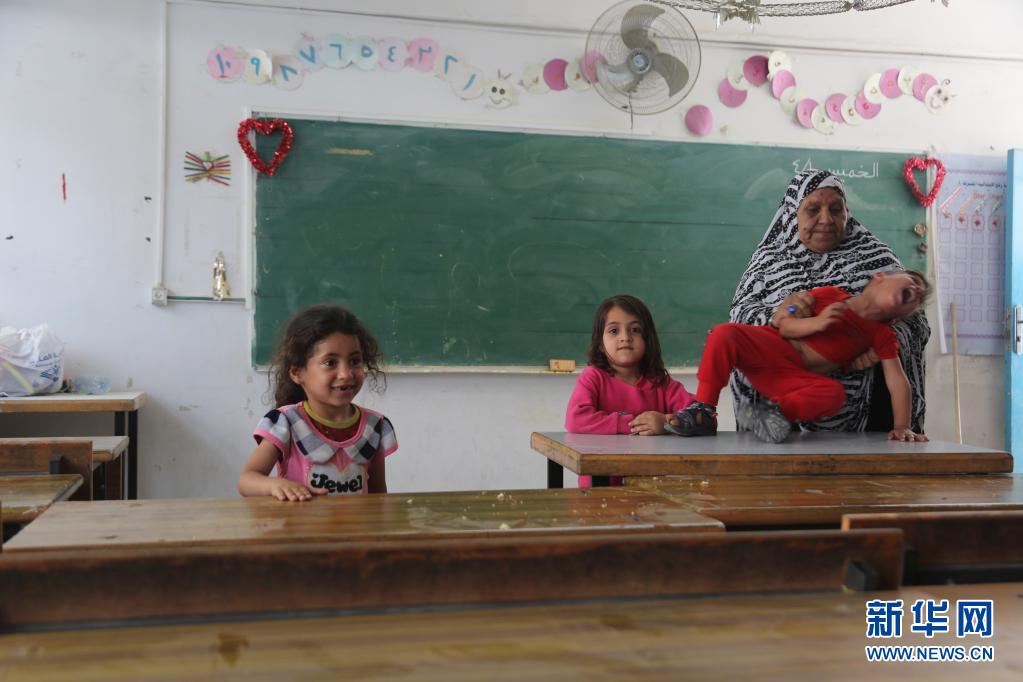 5月17日,受巴以沖突影響而逃離家園的巴勒斯坦婦女和兒童在加沙地帶拉法的一所學(xué)校臨時棲身。
