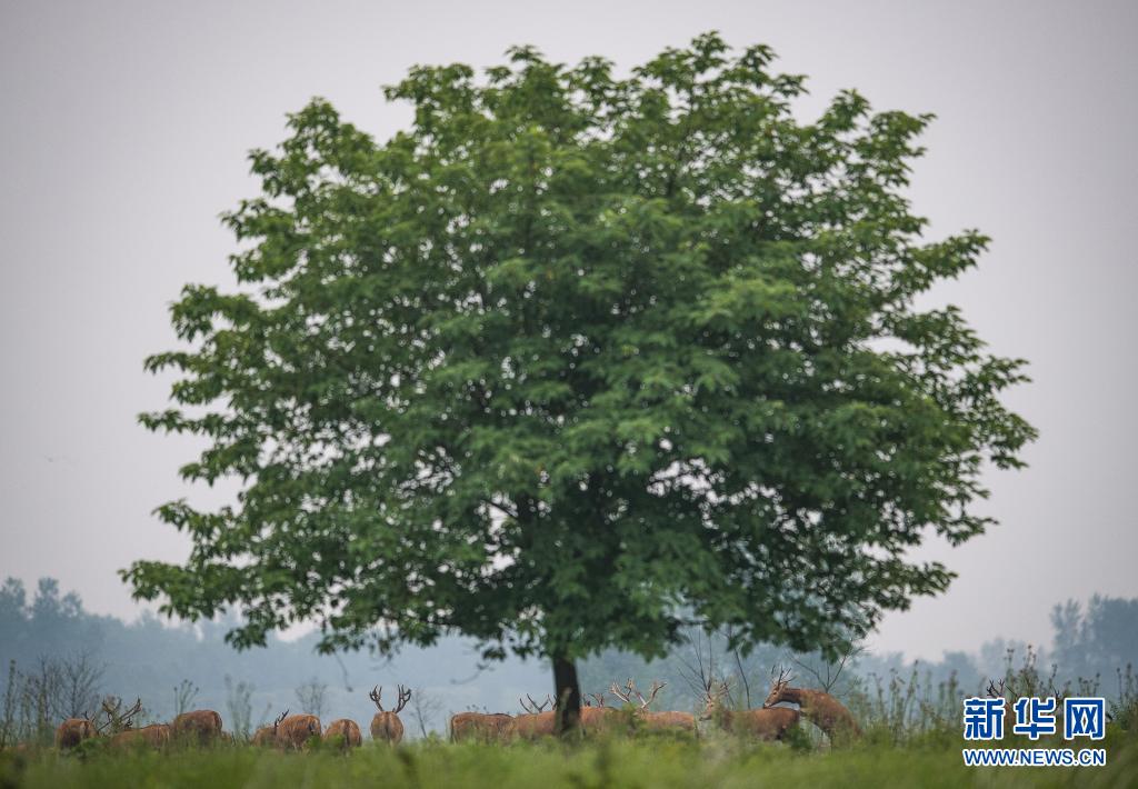 5月17日,一群麋鹿在石首麋鹿國家級自然保護(hù)區(qū)內(nèi)活動(dòng)。新華社記者 肖藝九 攝
