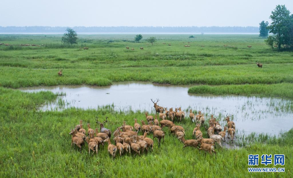 5月17日,一群麋鹿在石首麋鹿國家級(jí)自然保護(hù)區(qū)內(nèi)活動(dòng)(無人機(jī)照片)。新華社記者 肖藝九 攝