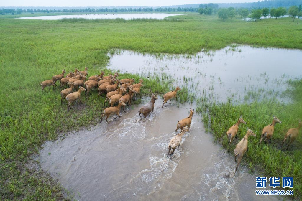 5月17日,一群麋鹿在石首麋鹿國家級自然保護區(qū)內(nèi)活動(無人機照片)。新華社記者 肖藝九 攝