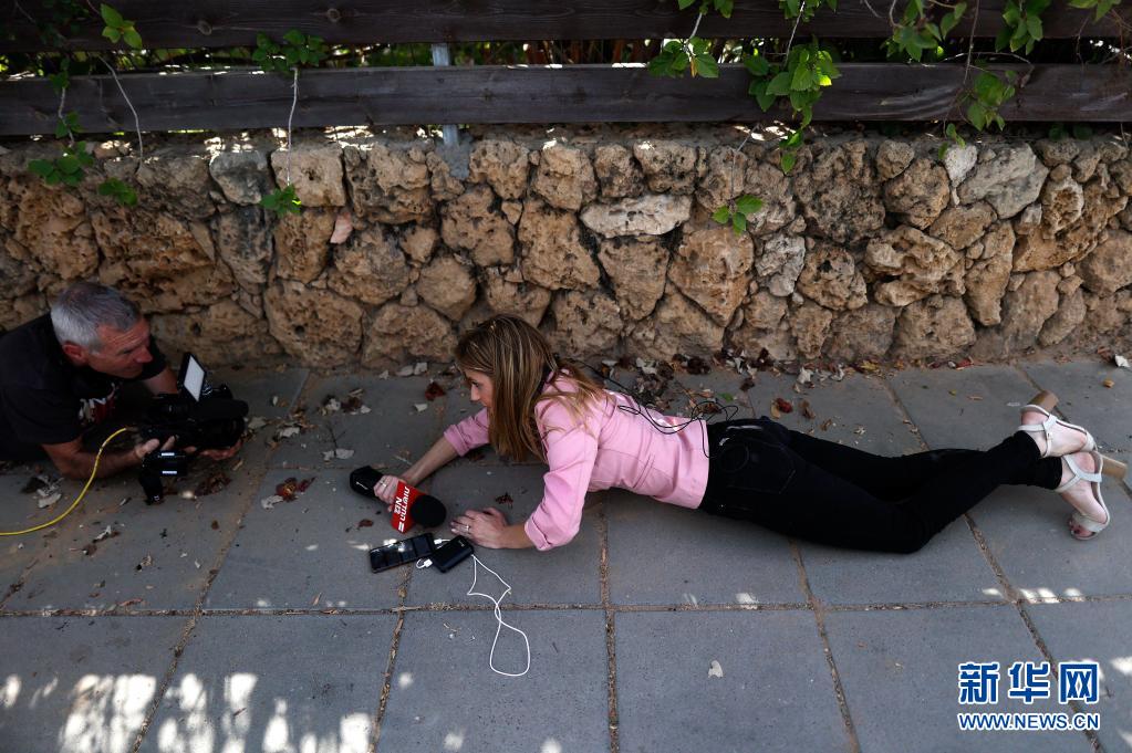 5月20日,人們在以色列南部城市阿什凱隆接到火箭彈襲擊警報后就地躲避。
