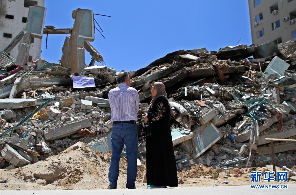 5月23日,巴勒斯坦人在加沙城望著遭以軍空襲損毀的賈拉塔。5月10日以來,以色列與加沙地帶武裝組織之間爆發(fā)嚴重沖突。20日晚,哈馬斯與以色列方面各自宣布,雙方已達成?;饏f(xié)議,?;饛?1日凌晨開始。新華社發(fā)(里澤克·阿卜杜勒·賈瓦德攝)