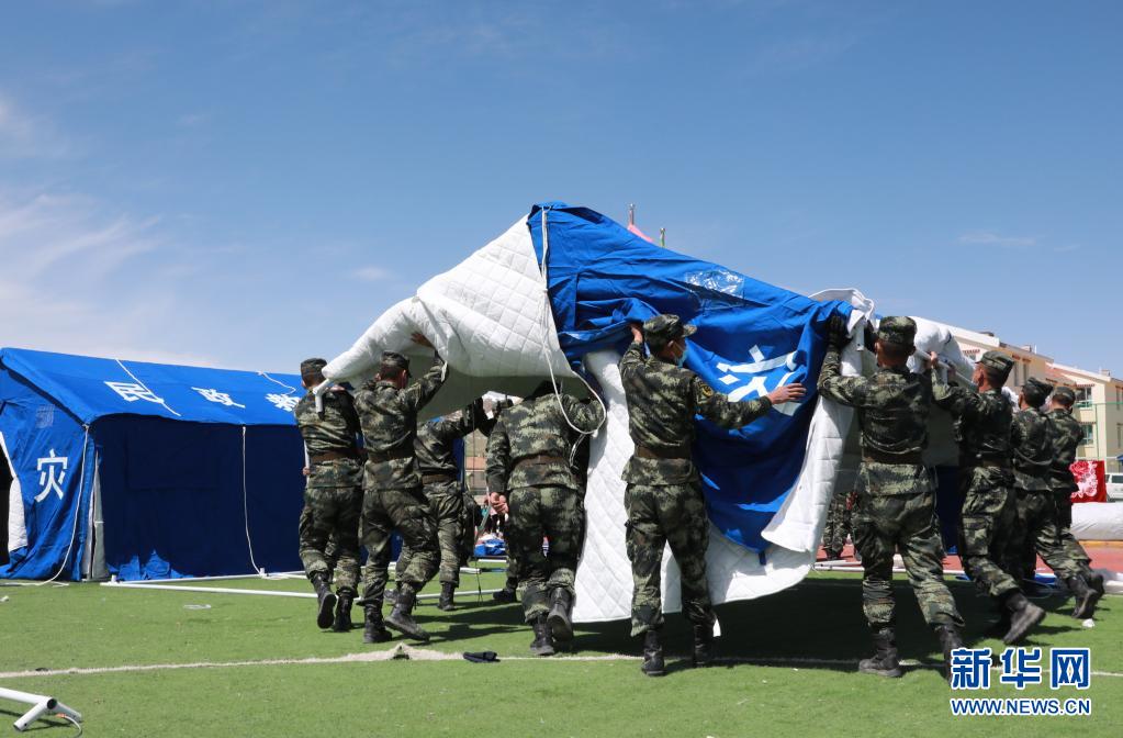 5月24日,武警青??傟牴逯ш牂C動大隊官兵為花石峽鎮(zhèn)藏文中心寄宿制小學(xué)搭建帳篷教室。新華社記者 劉新 攝