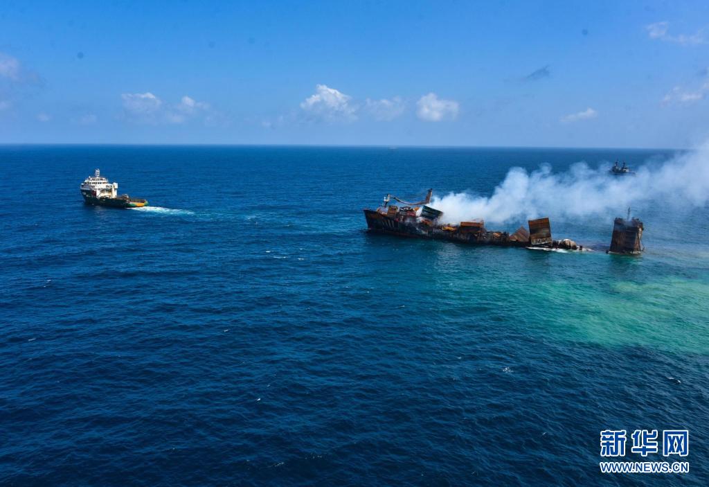 這是6月2日在斯里蘭卡科倫坡港附近拍攝的逐漸下沉的起火貨船“X-PRESS PEARL”號(右)。