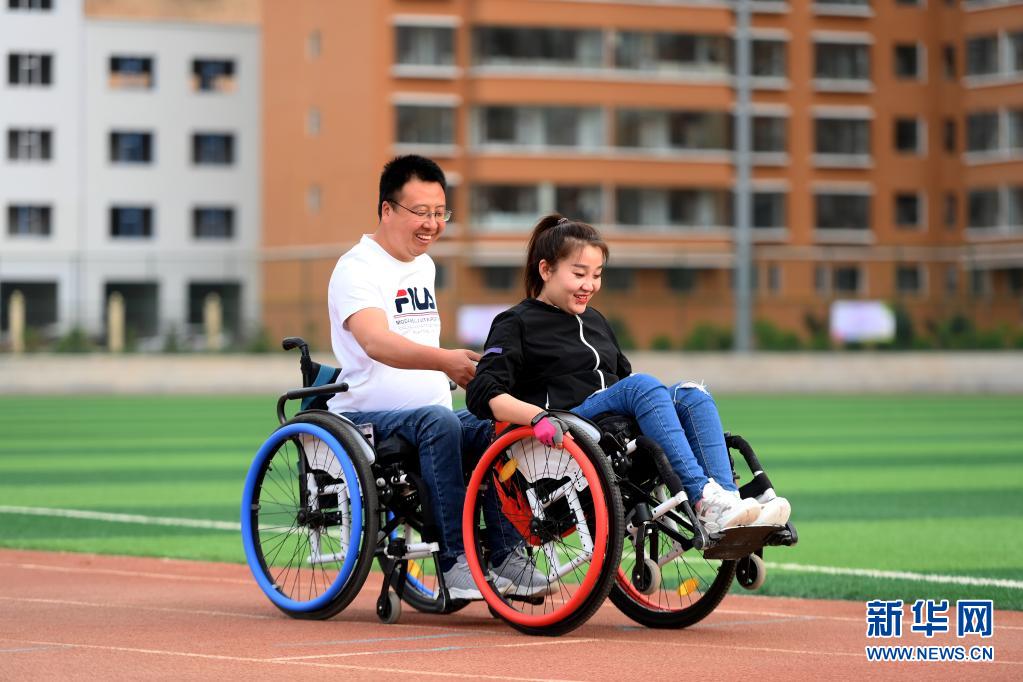 在山西省呂梁市石樓縣體育中心,關(guān)美(右)和周海云在進行康復(fù)訓(xùn)練(6月2日攝)。新華社發(fā)(劉亮亮攝)